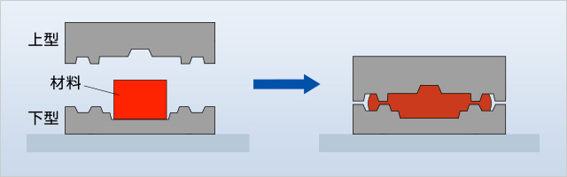 型鍛造は、上下1組の金型の間に材料を入れ、機械で押し潰して狙った形状に加工する方法です。同一形状の製品を大量生産することに向いており、高い寸法精度を得られ、スピーディーに成形加工を行うことが可能です。ただし、金型製作に初期費用が必要となるため、少量生産には不向きと言えます。また、型鍛造は、その加工温度によって「熱間鍛造」「冷間鍛造」があるほか、それらの中間温度で両方のメリットを得る「温間鍛造」も行われています。