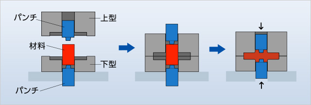 パンチの動作方向に対して、材料がどの方向に押し出されるかによって、次の3つに分類されます。